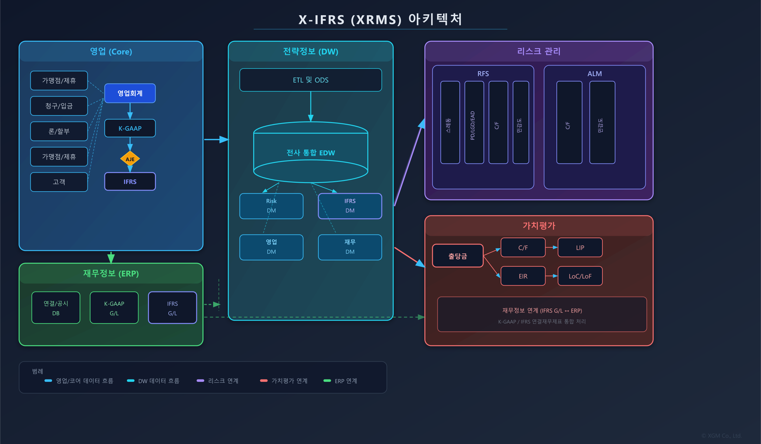 금융분야의 USGAAP,BASEL,IFRS 구축 등의 경험을 바탕으로 개발된 X-IFRS는영업시스템, 정보계 (DW) 및 재무 회계 시스템 영역 전반에 걸쳐 수정 및 신규 개발이 발생, RISK관리 등 유관 시스템과의 공동연계 등을 위해, 전체적인 시각으로 접근하여 시스템간의 White Space가 발생하지 않도록 Customizing하여 적용됩니다.X-IFRS(XRMS)의 아키텍처